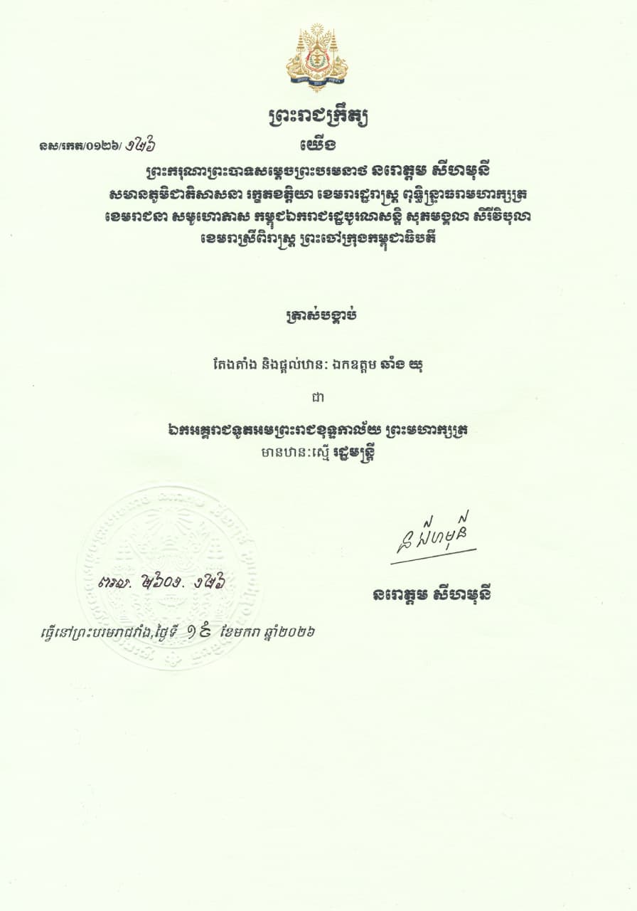 លោក ឆាំង យុ នាយកមជ្ឈមណ្ឌលឯកសារកម្ពុជា ទទួលបានព្រះត្រាស់បង្គាប់តែងតាំងនិងផ្ដល់ឋានៈជាឯកអគ្គរាជទូតអមព្រះរាជខុទ្ទកាល័យព្រះមហាក្សត្រ មានឋានៈស្នើរដ្ឋមន្រ្តី
